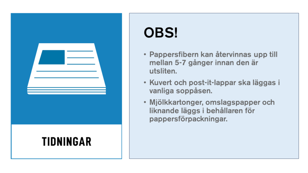 Tänk på att ta bort plastomslag och påklistrade reklamlappar och post-itlappar innan trycksaken/tidningen läggs i behållaren. Minsta lilla klisterklump från t ex en post-itlapp kan orsaka stopp i återvinningsprocessen.